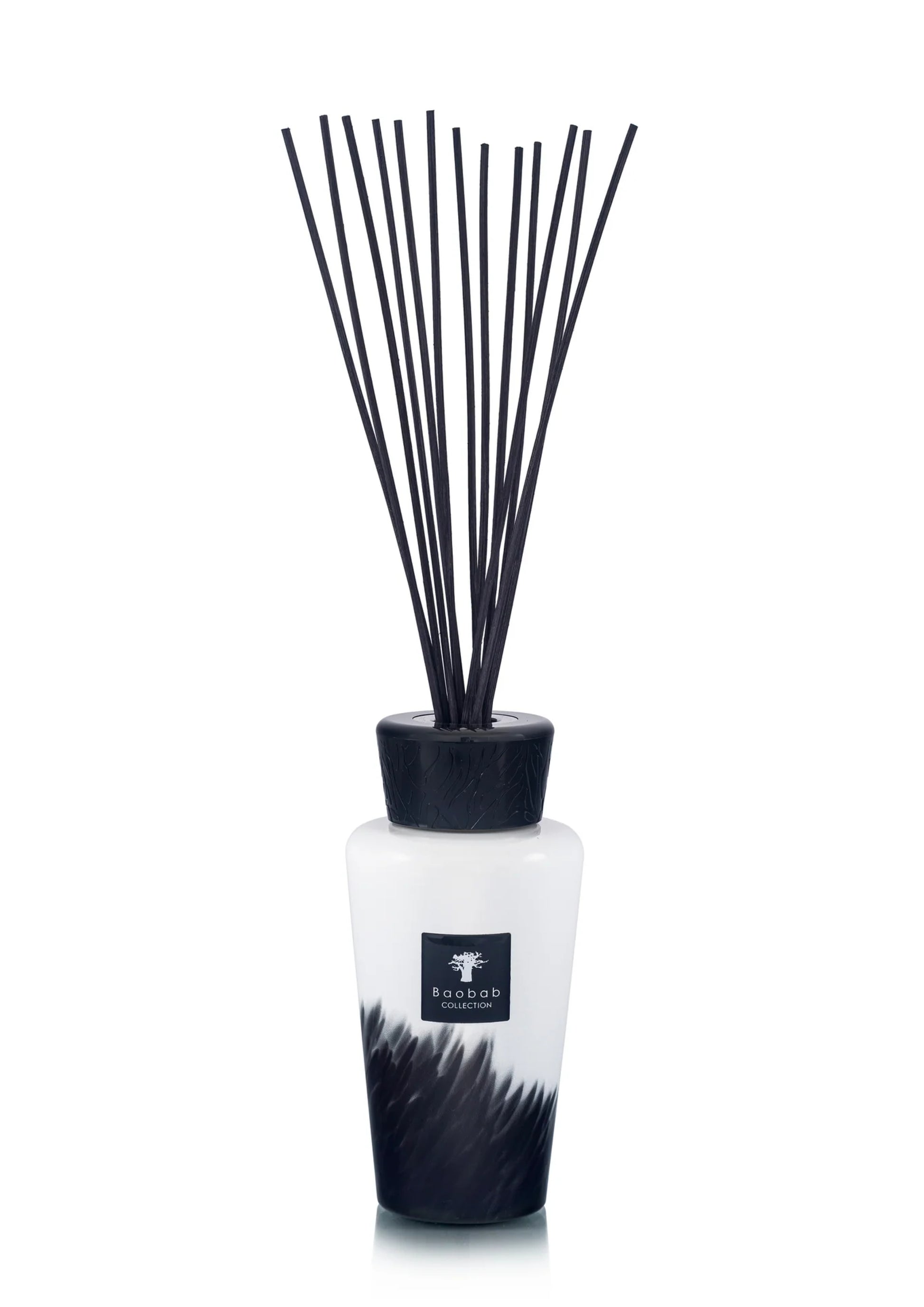 De Feathers diffuser van 500 ml is uitgevoerd in opaalkleurig wit glas met fijne zwarte details die een subtiel veereffect creëren en een verfijnde balans tonen tussen kracht en zachtheid.
