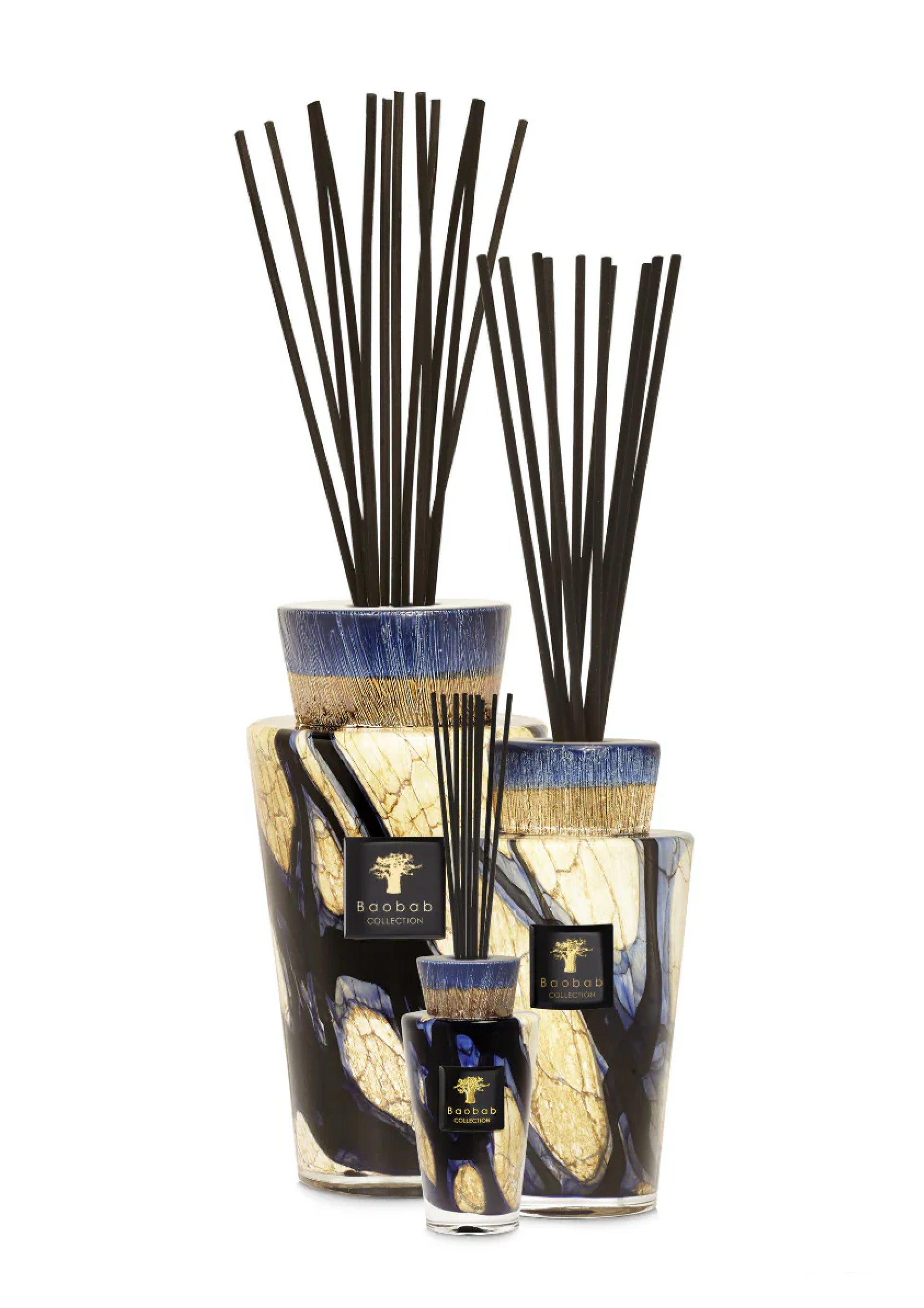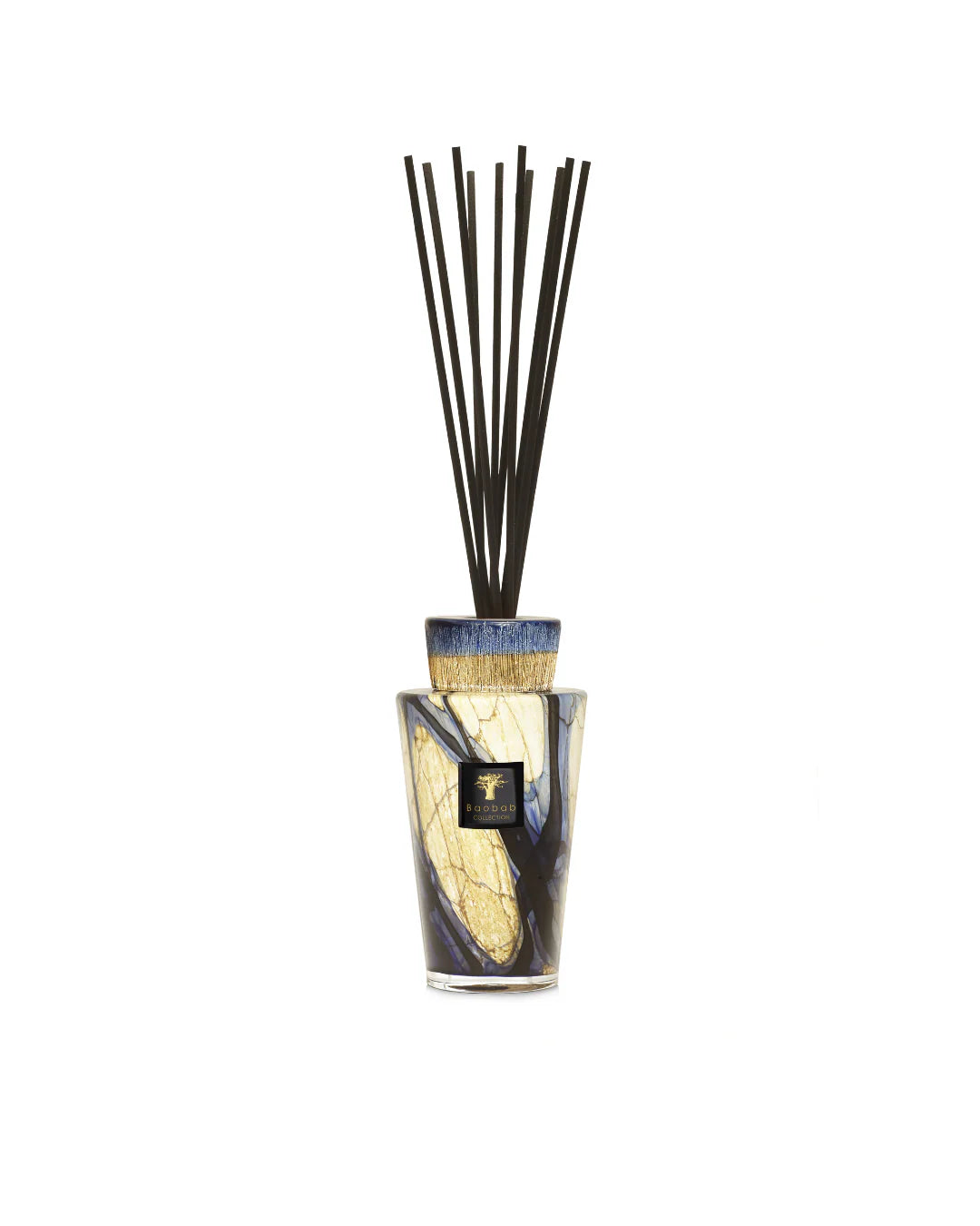 De Totem Lazuli diffuser is geïnspireerd op de magie van diepblauwe edelstenen, met handgeblazen glas en een keramische dop in kobaltblauw en oudgoud voor een verfijnde uitstraling.